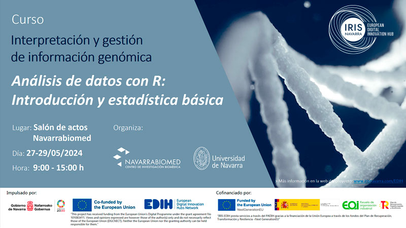 Navarrabiomed en colaboración con la Universidad de Navarra organiza el curso en interpretación y gestión de información genómica "Análisis de datos con R: Introducción y estadística básica", organizado en el marco de IRIS Navarra, Polo de Innovación Digital y del proyecto europeo IRIS EDIH.