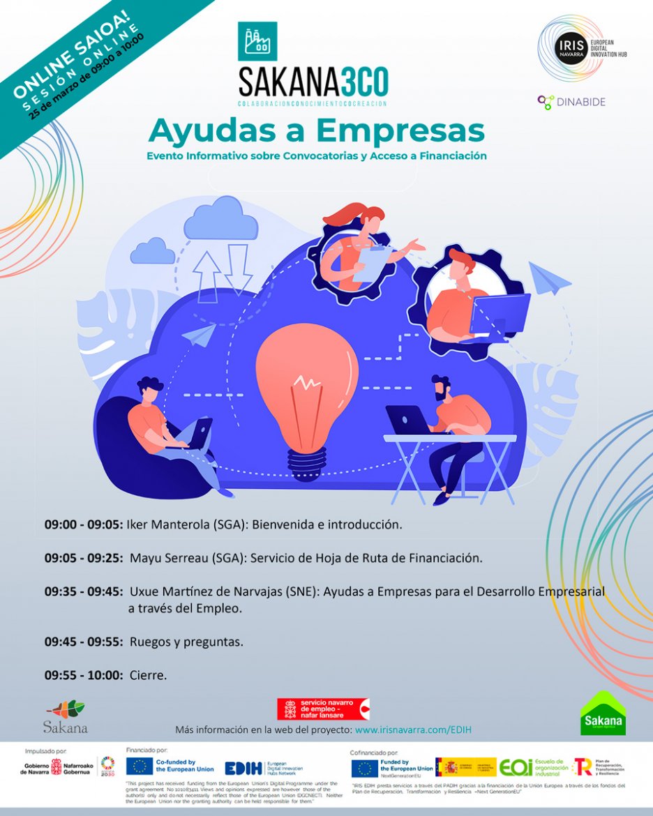 Dentro del marco del PES 2021-27 y el proyecto europeo IRIS, la Agencia de Desarrollo de Sakana (DINABIDE) ha organizado el próximo 25 de marzo, martes entre las 09:00 y las 10:00h una jornada informativa de manera online. Esta sesión será breve y concisa, y cercana y resolutiva, en la cual se hablará de diversos tipos de ayudas a empresas, concretamente sobre convocatorias y acceso a financiación.