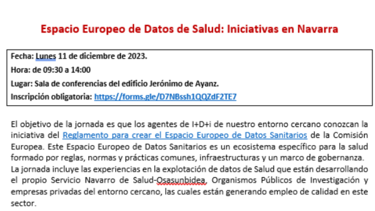 11/12/2023 - 11/12/2023 9:30h - 14:00h Institutos De Investigación Upna, Calle Tajonar 22, Pamplona, Navarra, ES, 31006 Sala de conferencias del edificio Jerónimo de Ayanz. REGISTER Espacio Europeo de Datos de Salud: Iniciativas en Navarra Evento organizado por Navarra Health Cluster
