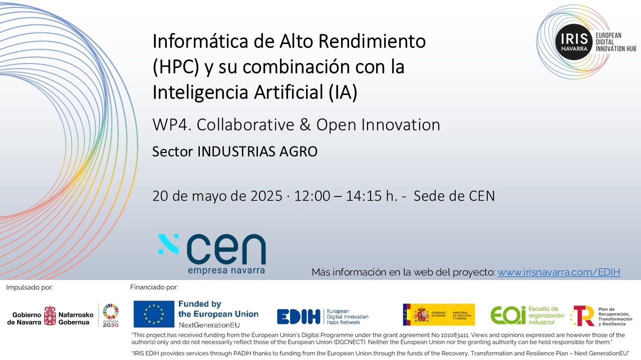 20/05/2025 - 20/05/2025 12:00 - 14:15 Confederación de Empresarios de Navarra (CEN) Dirigido a: Sector INDUSTRIAS AGRO REGISTER Informática de Alto Rendimiento (HPC) y su combinación con la Inteligencia Artificial (IA) #IRISEDIH WP4. Collaborative & Open Innovation. Sector INDUSTRIAS AGRO Categoría Evento EDIH