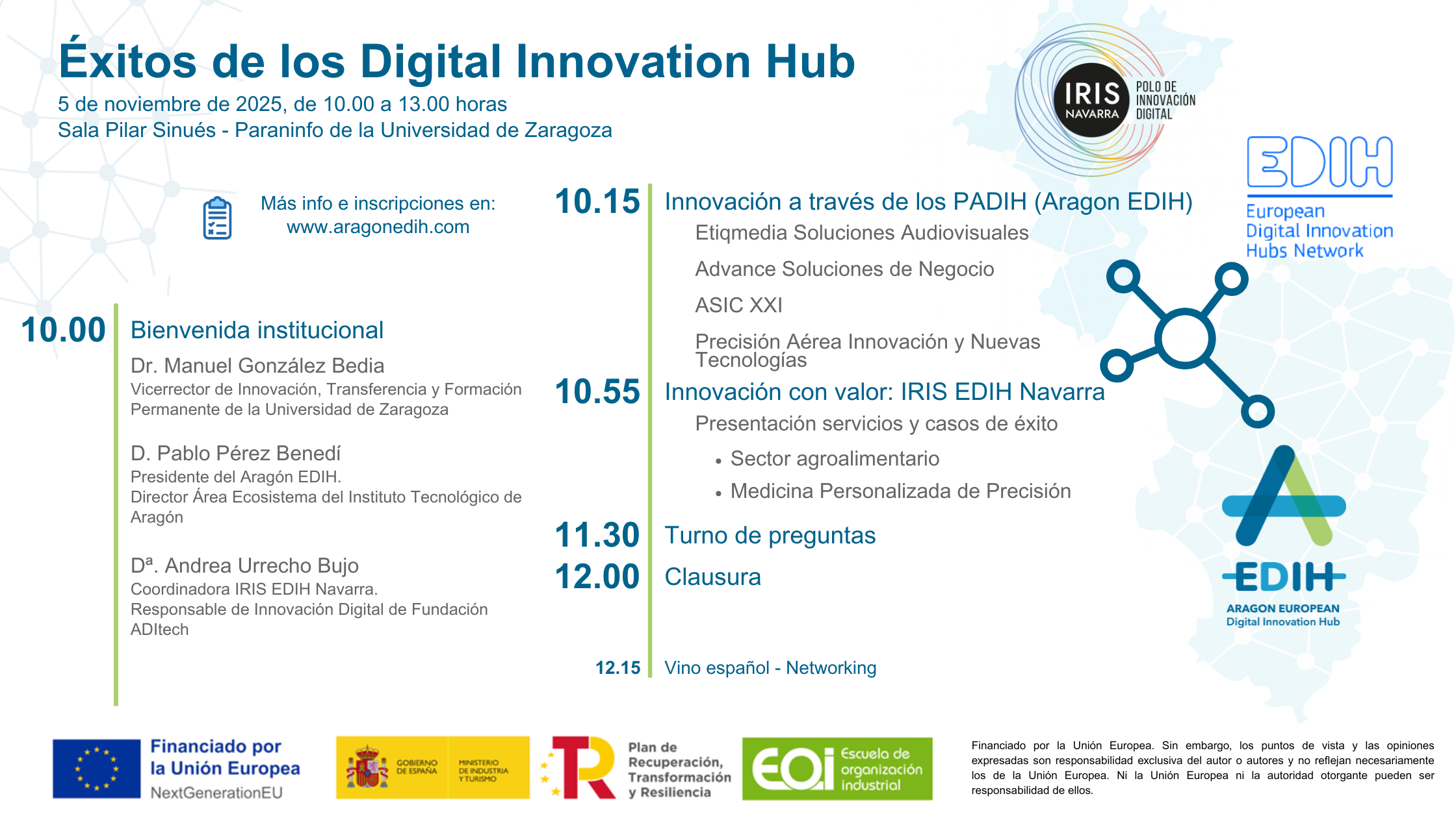 Inscríbete AQUÍ y conoce de cerca Casos de Éxito de los EDIH de Aragón y Navarra en un evento que tendrá lugar el 5 de noviembre en el Paraninfo de la Universidad de Zaragoza de 10 a 12:15 horas.